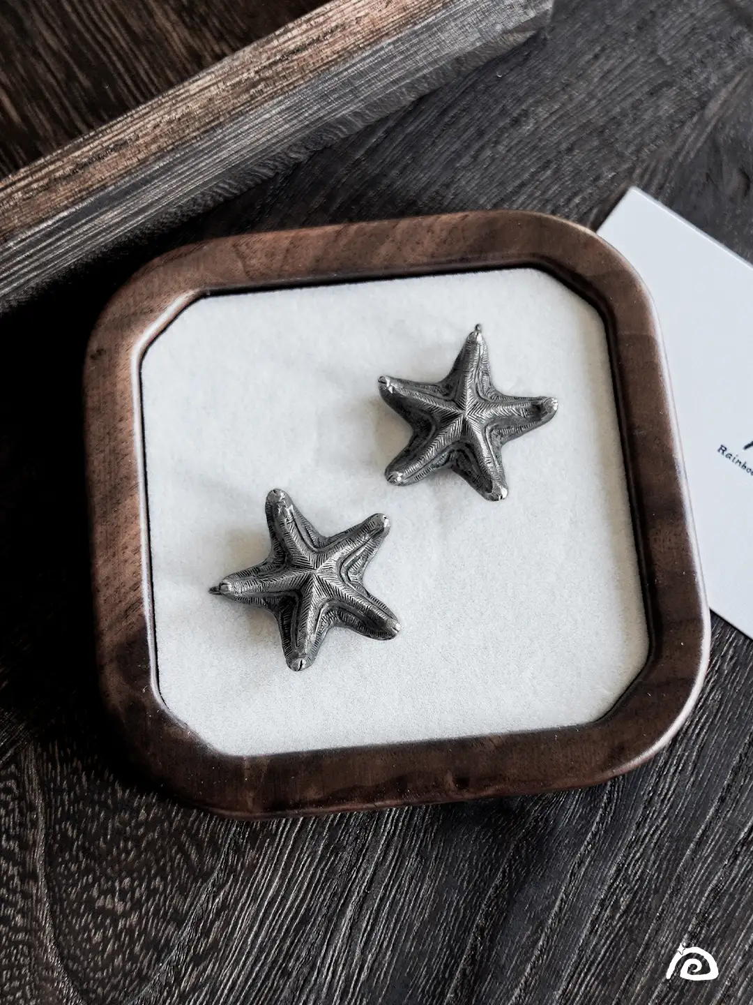 All of the materials used to create this vintage starfish necklace are 925 sterling silver. The silver is given a deep, misty patina with a unique oxidized finish, which highlights the realistic texture of the starfish, which resembles an old ocean relic sculpted by years of tides and silent recollections.