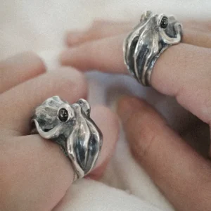 This octopus ring’s eyes, which are two black zircon stones that give off a gentle, enigmatic glimmer, are its main feature. They evoke a feeling of serene observation, as if the ring sees more than it shows. The design consequently has a living presence that conveys subtle authority and depth.
