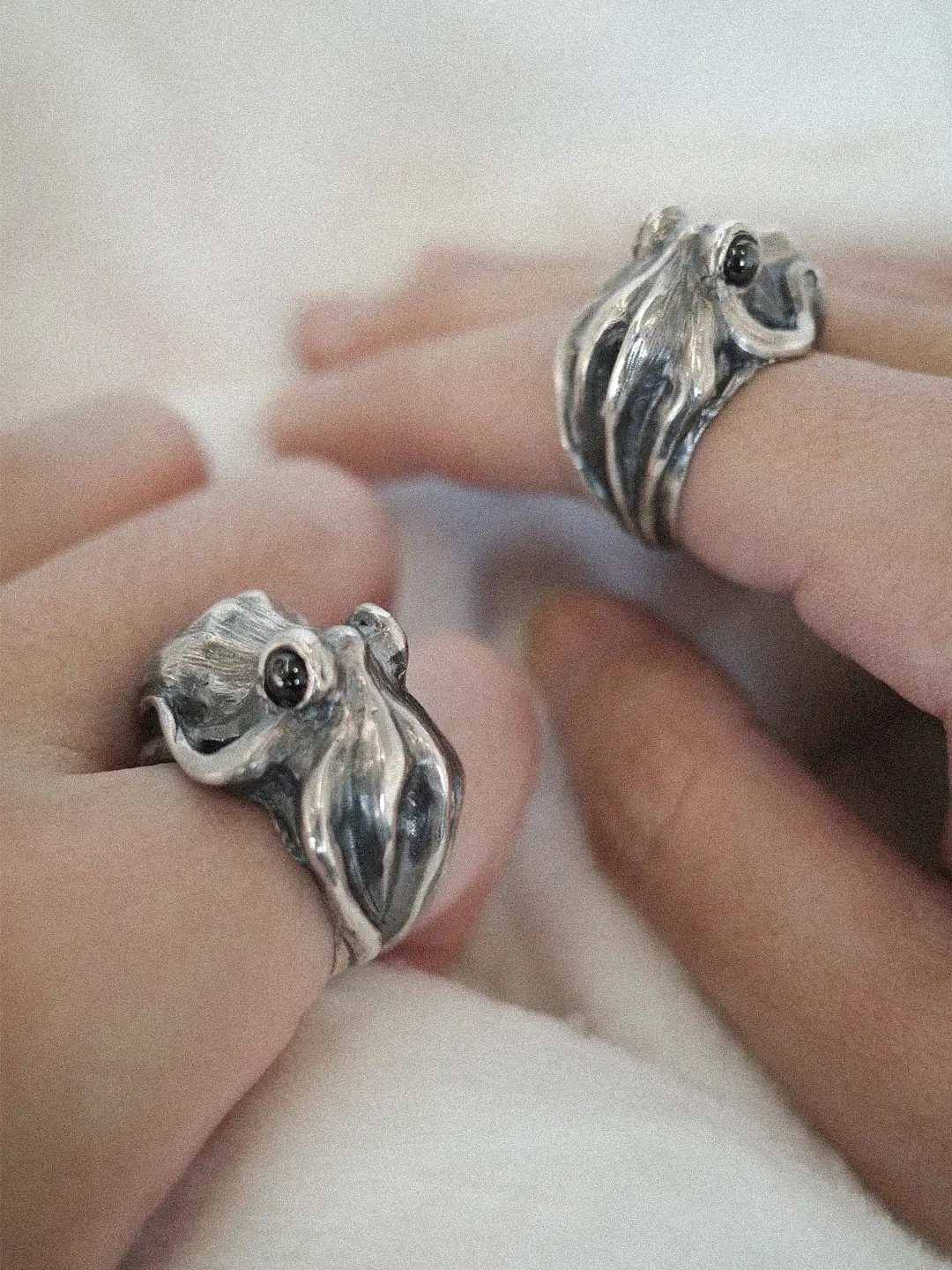 In the quiet darkness of the deep sea, a pair of black zircon eyes slowly opened. Crafted from 925 sterling silver, this octopus ring embodies the mysterious grace of its natural form. The silver body seems to sway gently, as though slowly swimming through the shadowy depths, all while emitting a subtle, knowing glow.